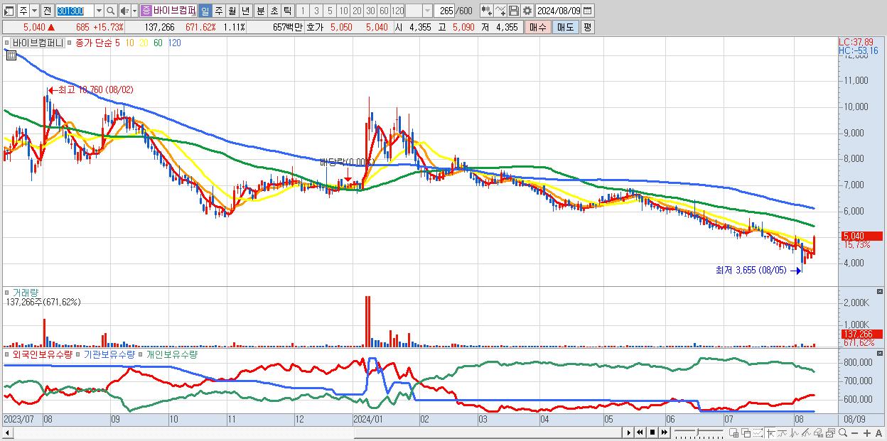 - 바이브컴퍼니 (5,040원 ▲ 15.73% , 시총: 625억, 거래량: 137,266, 거래대금:7억)