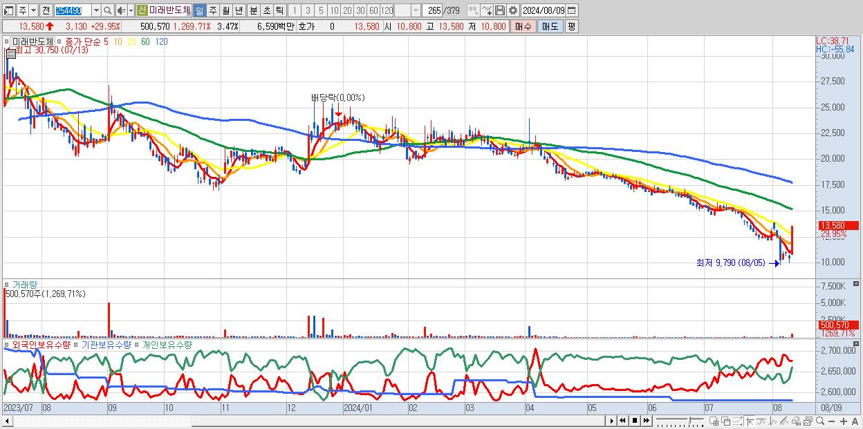 - 미래반도체 (13,580원 ▲ 29.95% , 시총: 1,961억, 거래량: 500,570, 거래대금:66억)