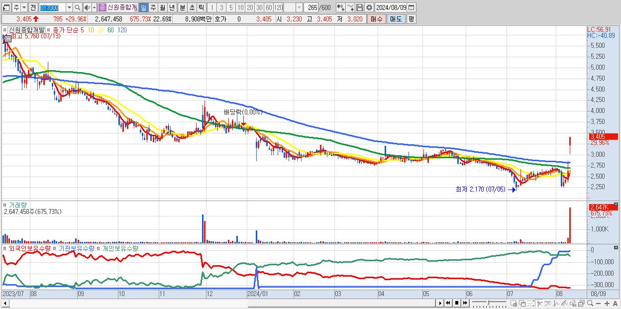 - 신원종합개발 (3,405원 ▲ 29.96% , 시총: 397억, 거래량: 2,647,458, 거래대금:89억)