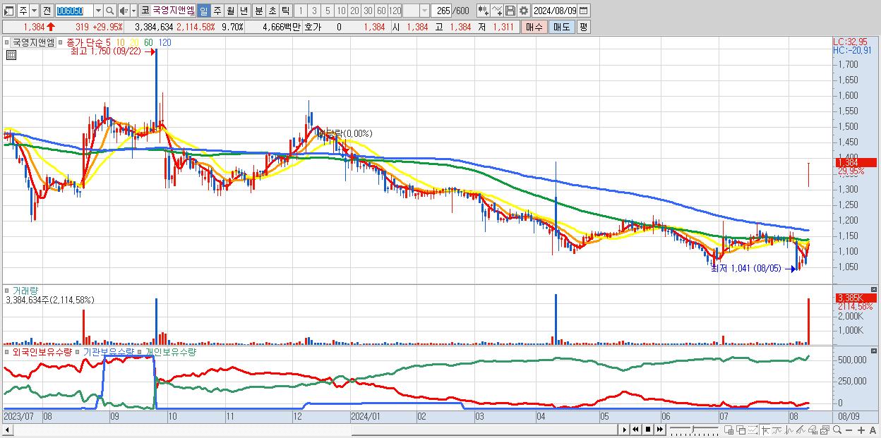 - 국영지앤엠 (1,384원 ▲ 29.95% , 시총: 483억, 거래량: 3,384,634, 거래대금:47억)