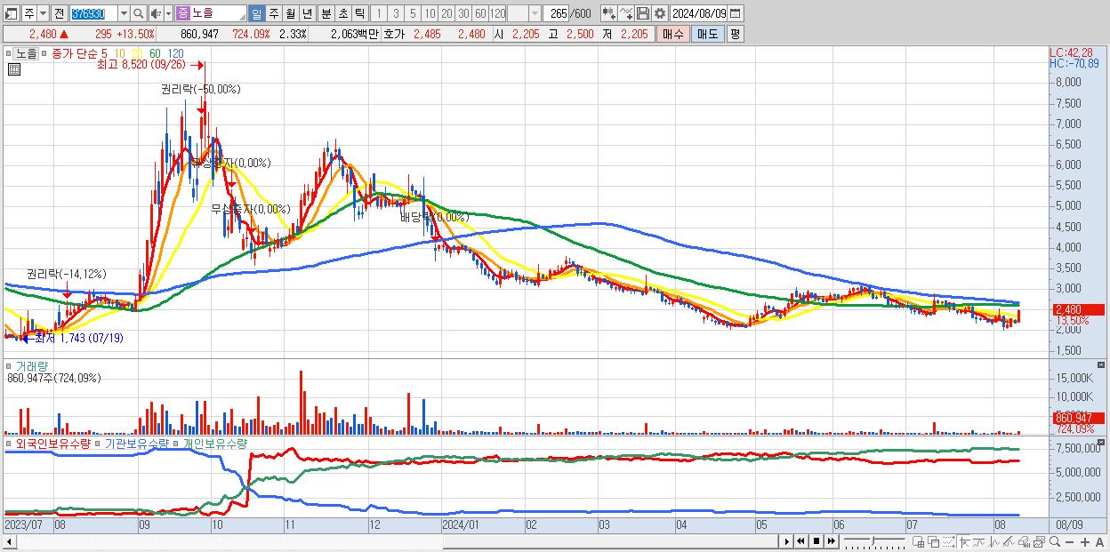 - 노을 (2,480원 ▲ 13.5% , 시총: 916억, 거래량: 860,947, 거래대금:21억)