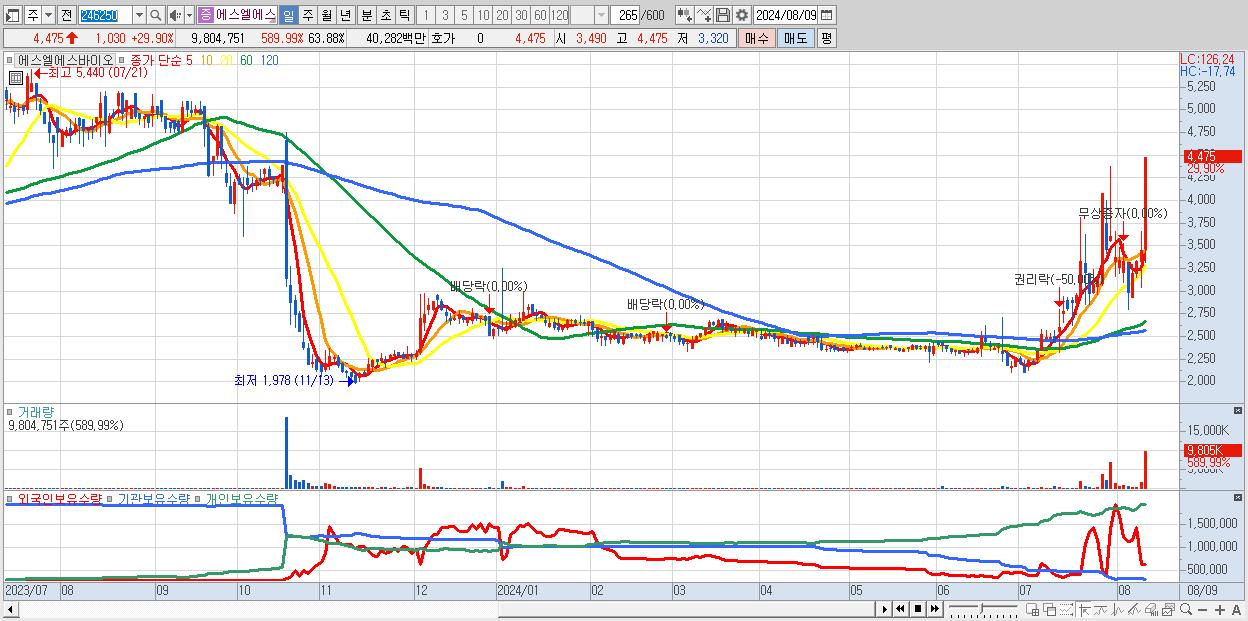 - 에스엘에스바이오 (4,475원 ▲ 29.9% , 시총: 687억, 거래량: 9,804,751, 거래대금:403억)
