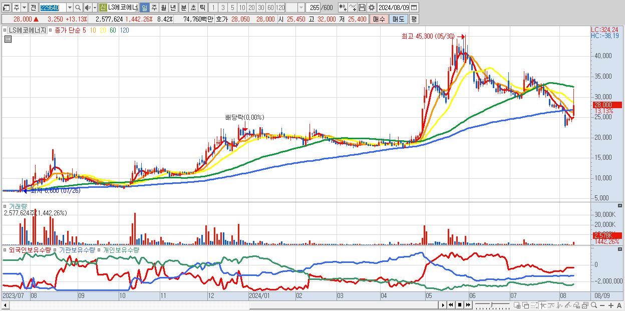 - LS에코에너지 (28,000원 ▲ 13.13% , 시총: 8,575억, 거래량: 2,577,624, 거래대금:748억)