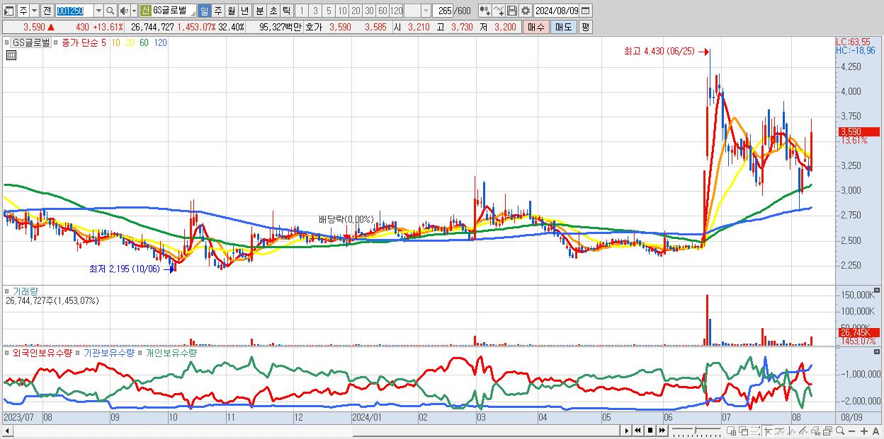 - GS글로벌 (3,590원 ▲ 13.61% , 시총: 2,963억, 거래량: 26,744,727, 거래대금:953억)