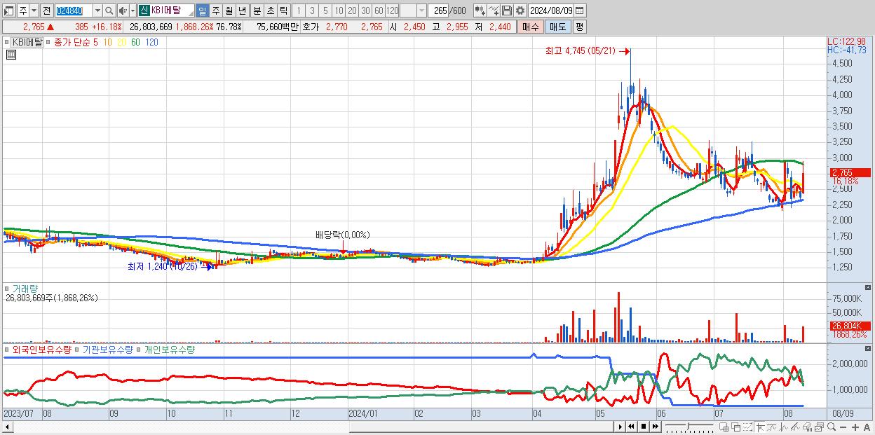 - KBI메탈 (2,765원 ▲ 16.18% , 시총: 965억, 거래량: 26,803,669, 거래대금:757억)