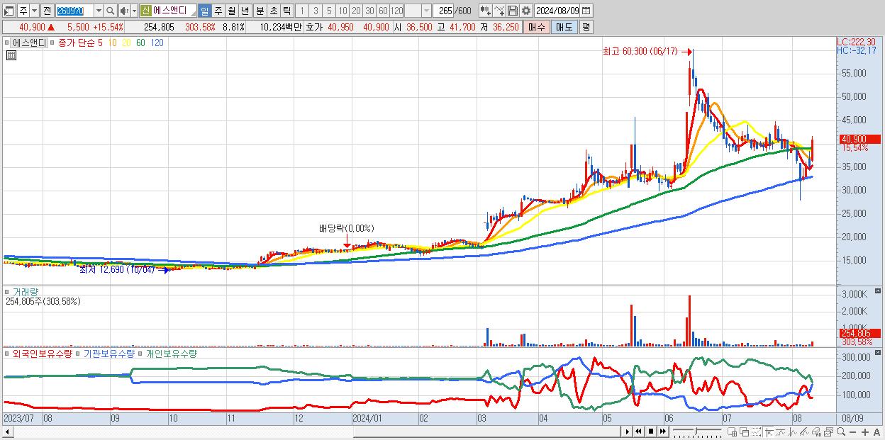- 에스앤디 (40,900원 ▲ 15.54% , 시총: 1,183억, 거래량: 254,805, 거래대금:102억)