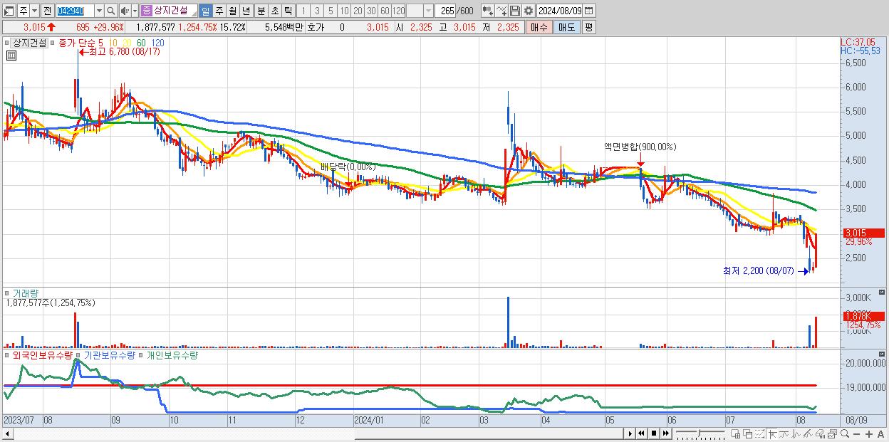 - 상지건설 (3,015원 ▲ 29.96% , 시총: 360억, 거래량: 1,877,577, 거래대금:55억)