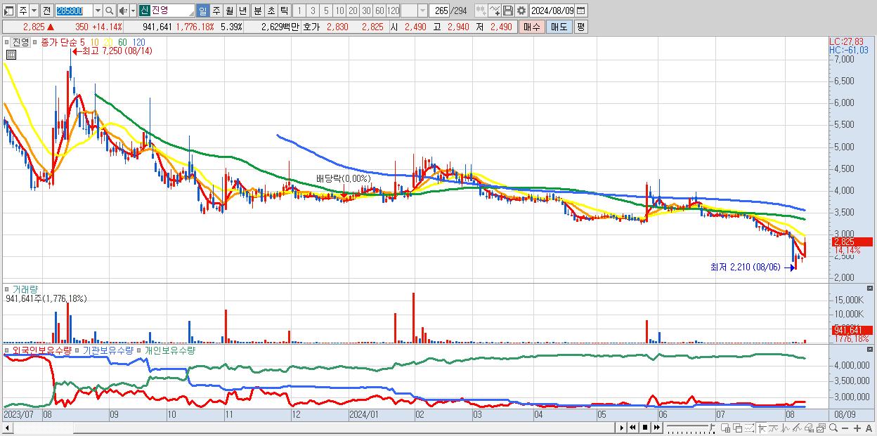 - 진영 (2,825원 ▲ 14.14% , 시총: 494억, 거래량: 941,641, 거래대금:26억)