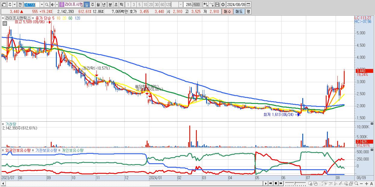 - 라이프시맨틱스 (3,440원 ▲ 19.24% , 시총: 573억, 거래량: 2,142,393, 거래대금:71억)