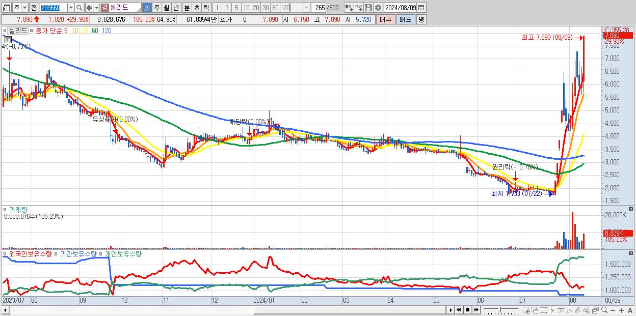 - 셀리드 (7,890원 ▲ 29.98% , 시총: 1,073억, 거래량: 8,828,676, 거래대금:618억)