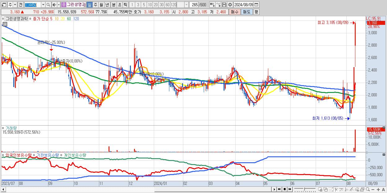 - 그린생명과학 (3,160원 ▲ 28.98% , 시총: 632억, 거래량: 15,558,939, 거래대금:458억)
