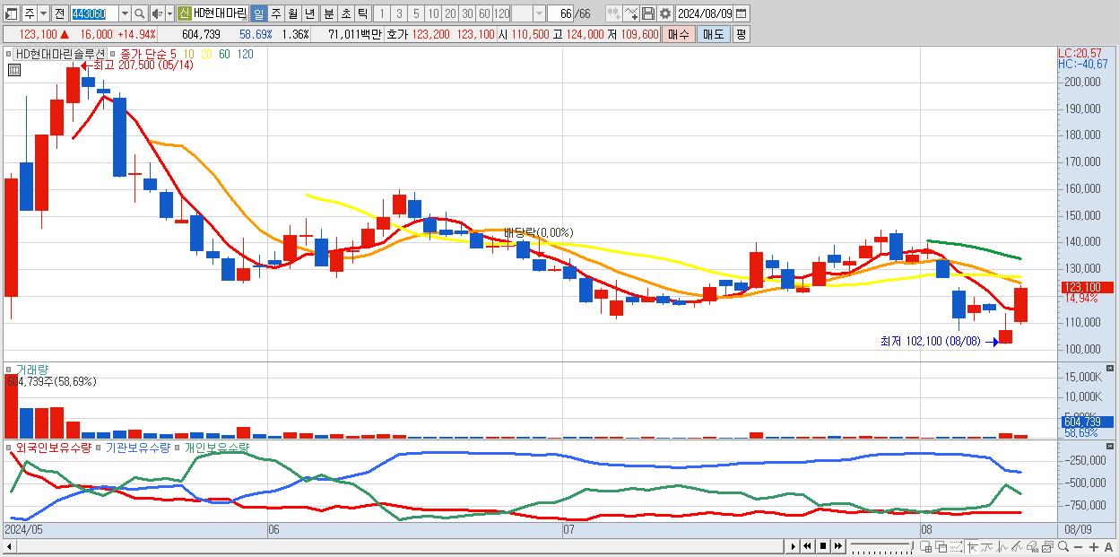- HD현대마린솔루션 (123,100원 ▲ 14.94% , 시총: 54,718억, 거래량: 604,739, 거래대금:710억)