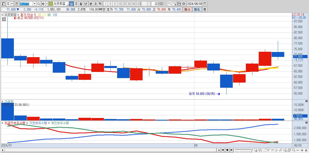 - 시프트업 (71,600원 ▼ -3.11% , 시총: 41,546억, 거래량: 1,551,101, 거래대금:1,149억)