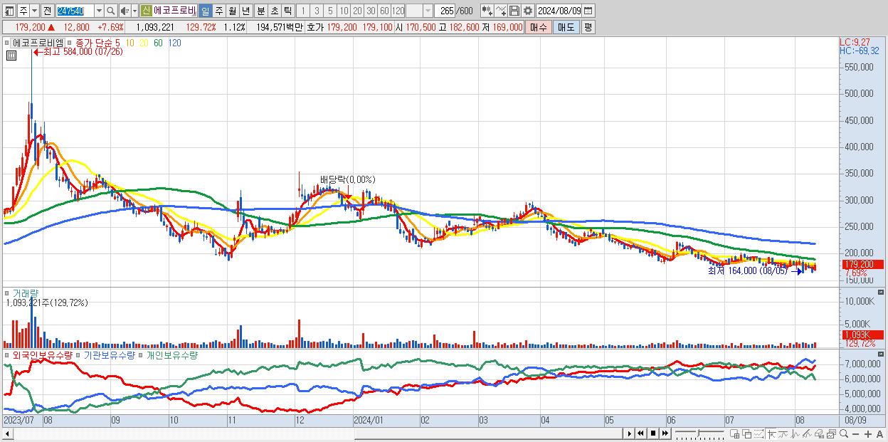 - 에코프로비엠 (179,200원 ▲ 7.69% , 시총: 175,260억, 거래량: 1,093,221, 거래대금:1,946억)