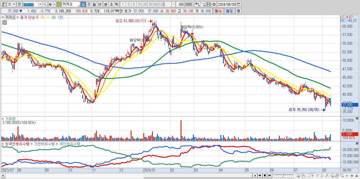 - 카카오 (37,000원 ▼ -3.77% , 시총: 164,092억, 거래량: 3,189,269, 거래대금:1,190억)