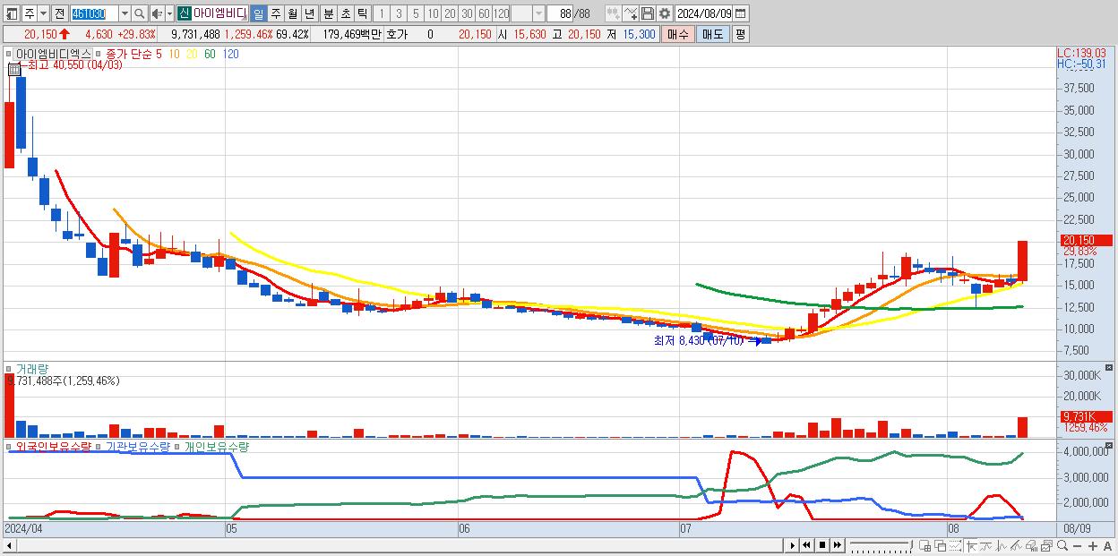 - 아이엠비디엑스 (20,150원 ▲ 29.83% , 시총: 2,825억, 거래량: 9,731,488, 거래대금:1,795억)