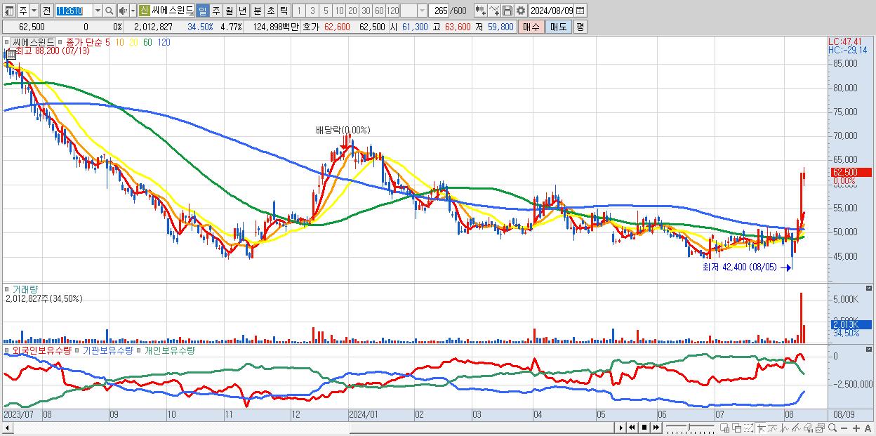 - 씨에스윈드 (62,500원 0% , 시총: 26,357억, 거래량: 2,012,827, 거래대금:1,249억)
