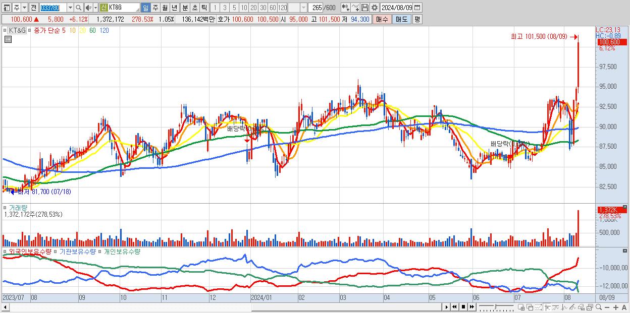 - KT&G (100,600원 ▲ 6.12% , 시총: 131,104억, 거래량: 1,372,172, 거래대금:1,361억)