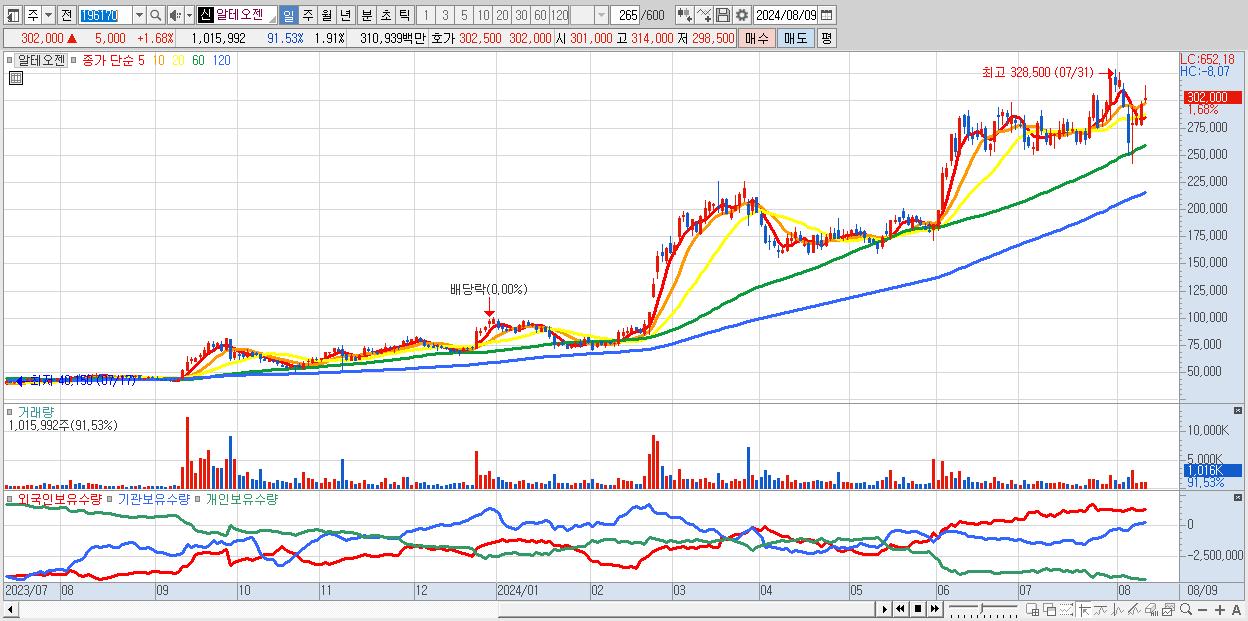 - 알테오젠 (302,000원 ▲ 1.68% , 시총: 160,509억, 거래량: 1,015,992, 거래대금:3,109억)