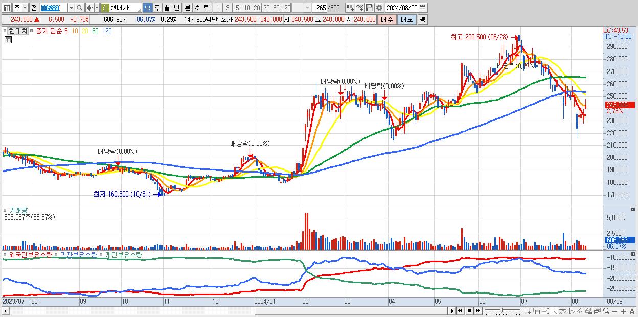 - 현대차 (243,000원 ▲ 2.75% , 시총: 508,881억, 거래량: 606,967, 거래대금:1,480억)