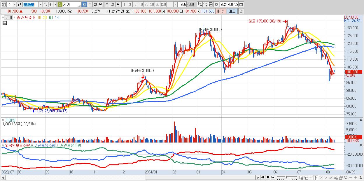 - 기아 (101,900원 ▲ 0.3% , 시총: 407,456억, 거래량: 1,080,152, 거래대금:1,112억)