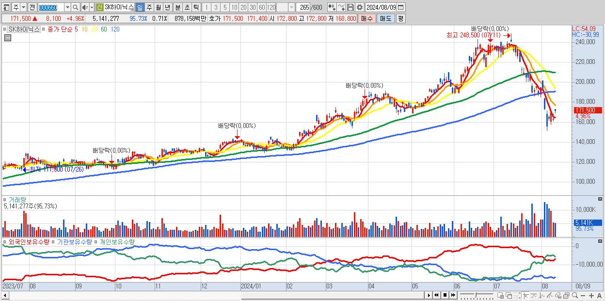 - SK하이닉스 (171,500원 ▲ 4.96% , 시총: 1,248,524억, 거래량: 5,141,277, 거래대금:8,782억)