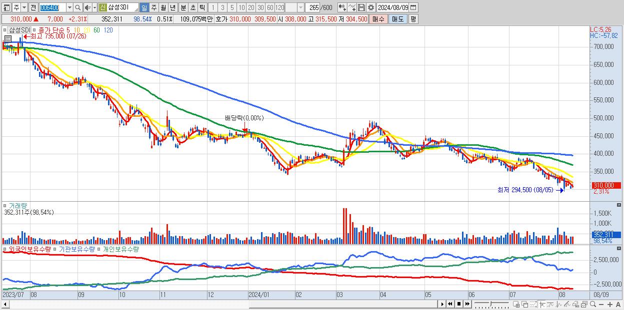 - 삼성SDI (310,000원 ▲ 2.31% , 시총: 213,170억, 거래량: 352,311, 거래대금:1,091억)