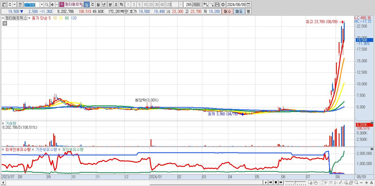 - 퀀타매트릭스 (19,500원 ▼ -11.36% , 시총: 3,225억, 거래량: 8,202,786, 거래대금:1,723억)
