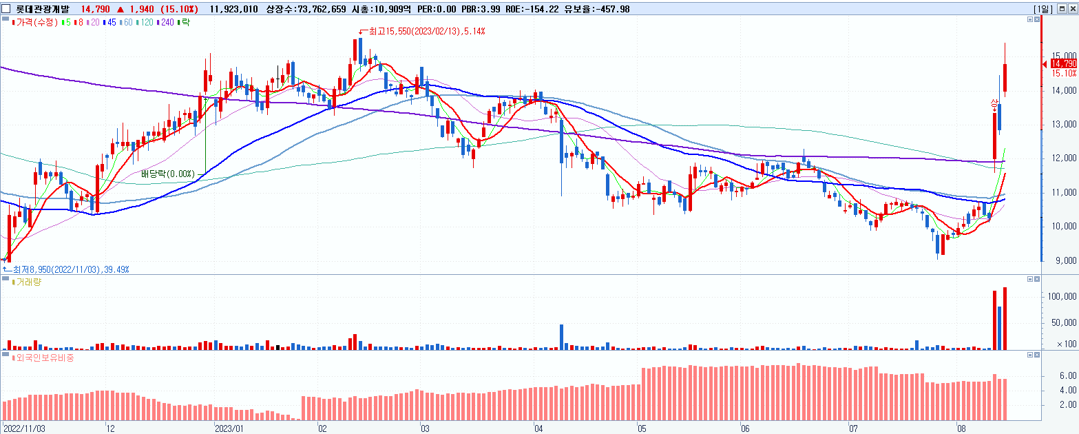 - 롯데관광개발 (14,790원 ▲ 15.1% , 시총: 10,909억, 거래량: 11,923,010, 거래대금:1,745억)