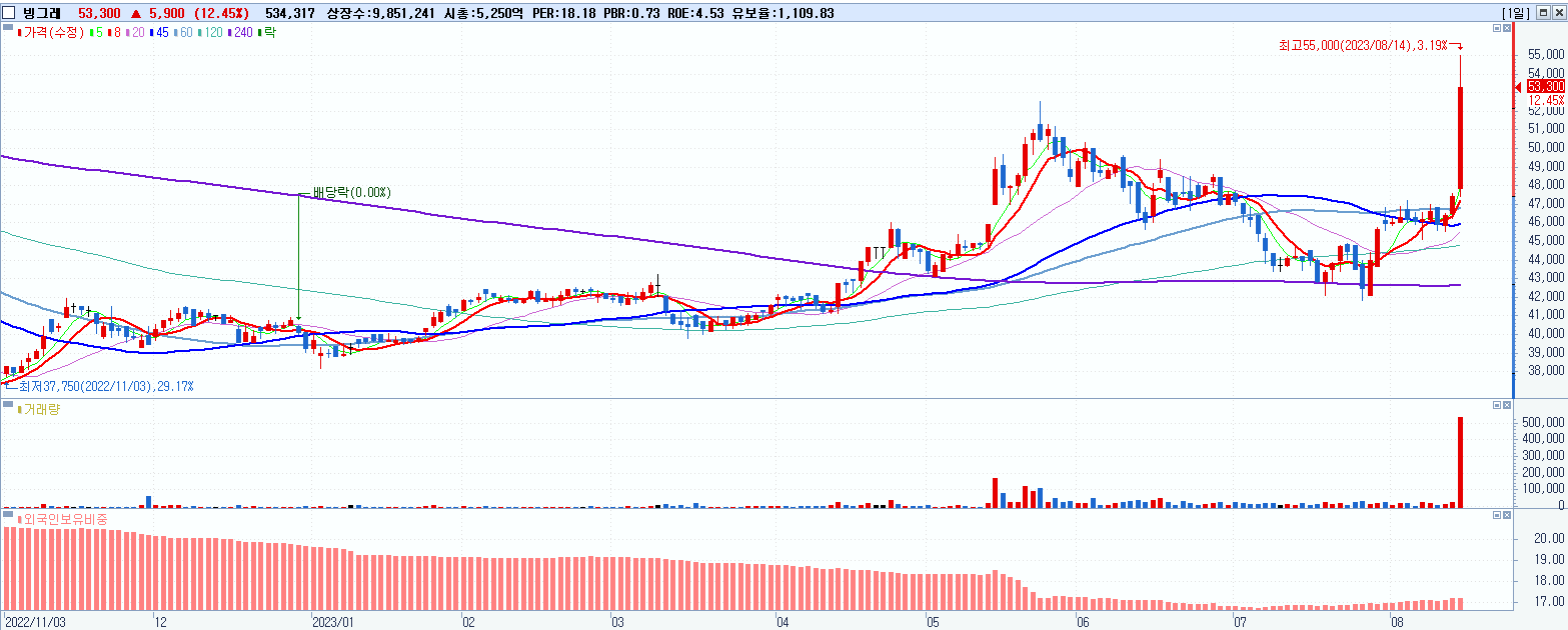 - 빙그레 (53,300원 ▲ 12.45% , 시총: 5,251억, 거래량: 534,317, 거래대금:281억)