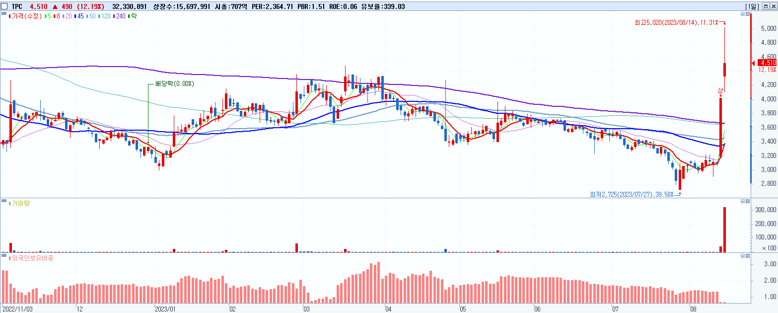 - TPC (4,510원 ▲ 12.19% , 시총: 708억, 거래량: 32,330,891, 거래대금:1,487억)