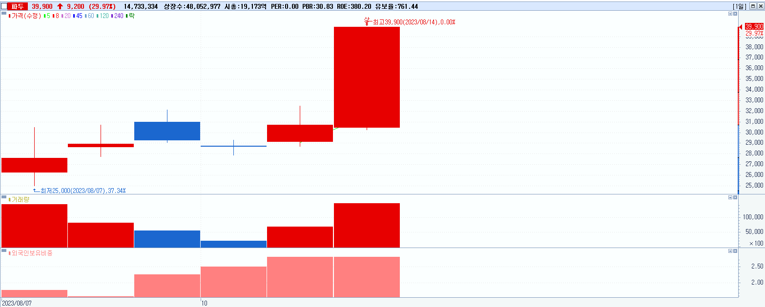 - 파두 (39,900원 ▲ 29.97% , 시총: 19,173억, 거래량: 14,733,334, 거래대금:5,221억)