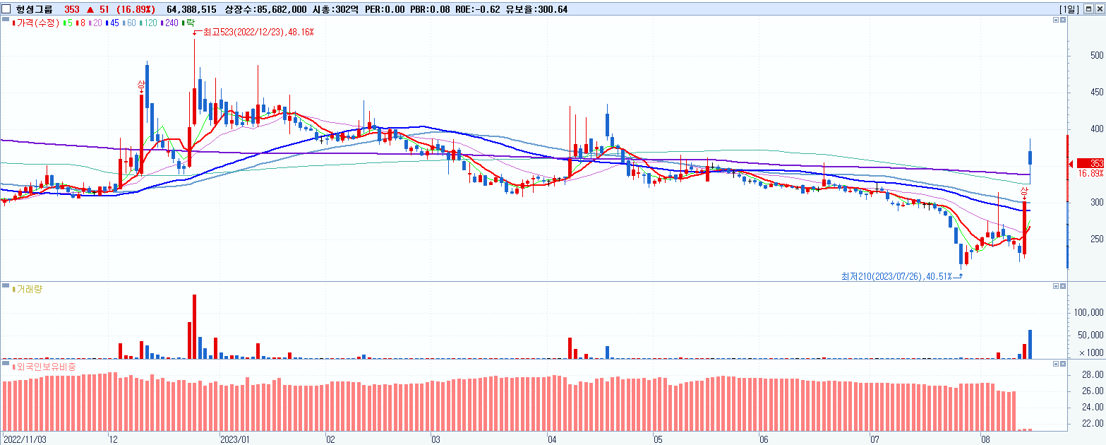 - 헝셩그룹 (353원 ▲ 16.89% , 시총: 302억, 거래량: 64,388,515, 거래대금:234억)