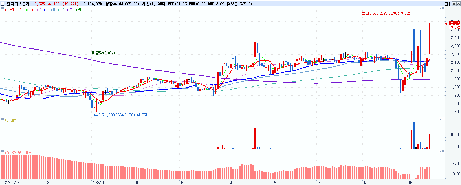 - 인지디스플레 (2,575원 ▲ 19.77% , 시총: 1,130억, 거래량: 5,164,878, 거래대금:123억)