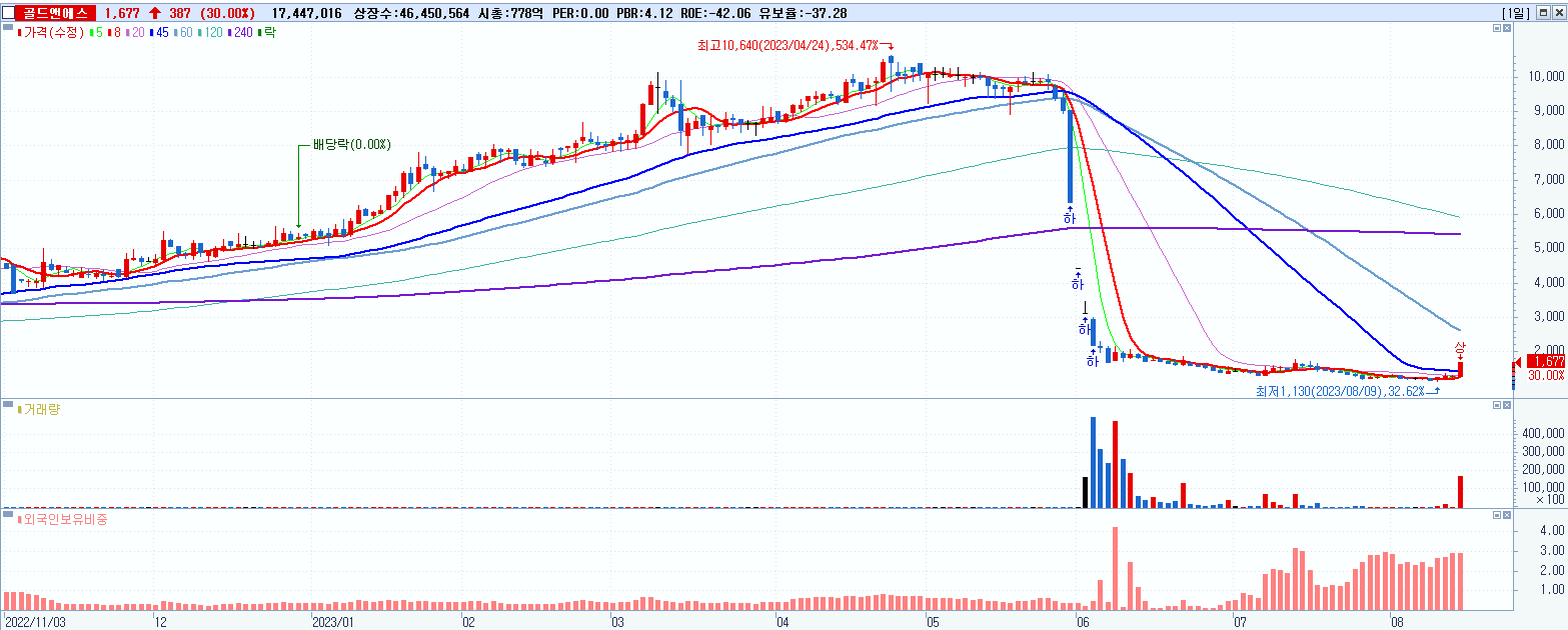 - 골드앤에스 (1,677원 ▲ 30% , 시총: 779억, 거래량: 17,447,016, 거래대금:281억)