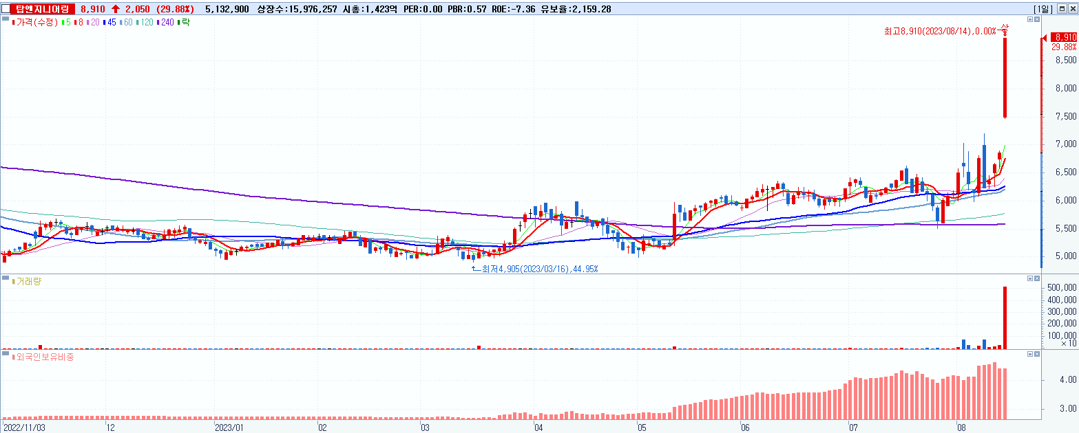 - 탑엔지니어링 (8,910원 ▲ 29.88% , 시총: 1,423억, 거래량: 5,132,900, 거래대금:432억)