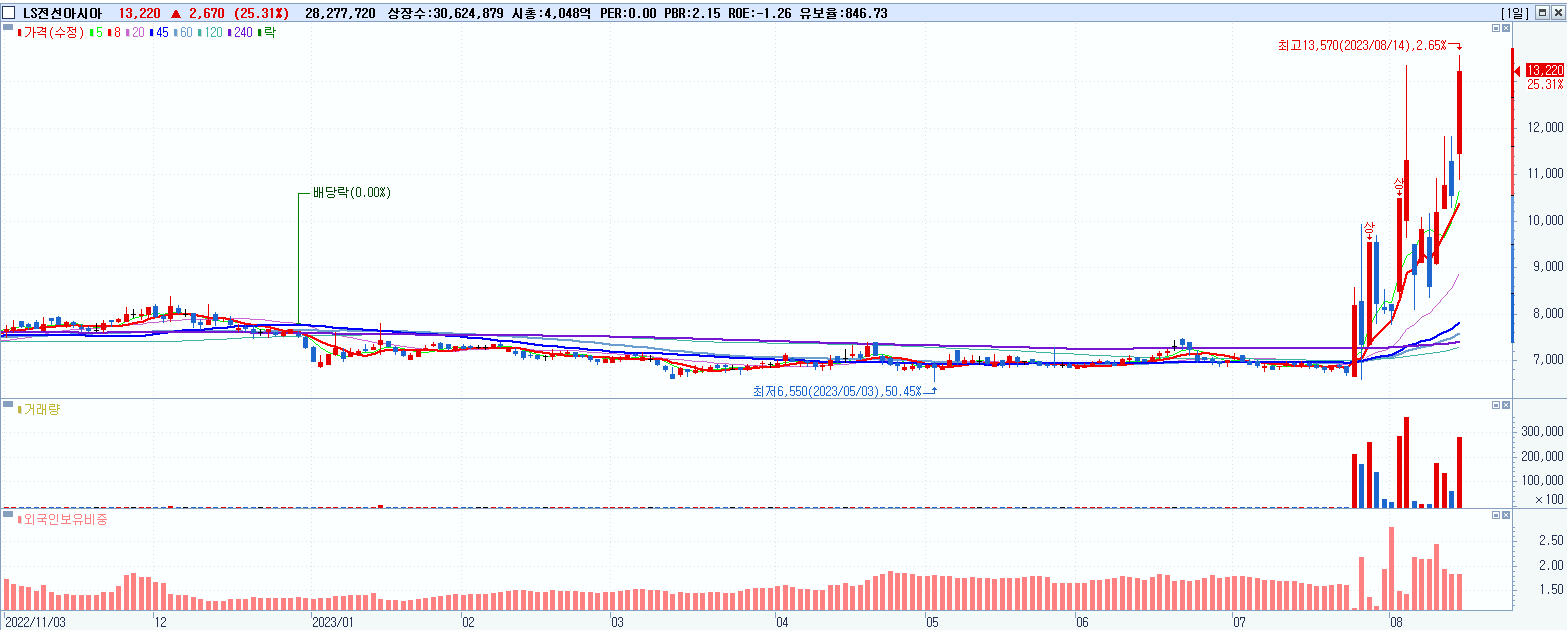 - LS전선아시아 (13,220원 ▲ 25.31% , 시총: 4,049억, 거래량: 28,277,720, 거래대금:3,567억)