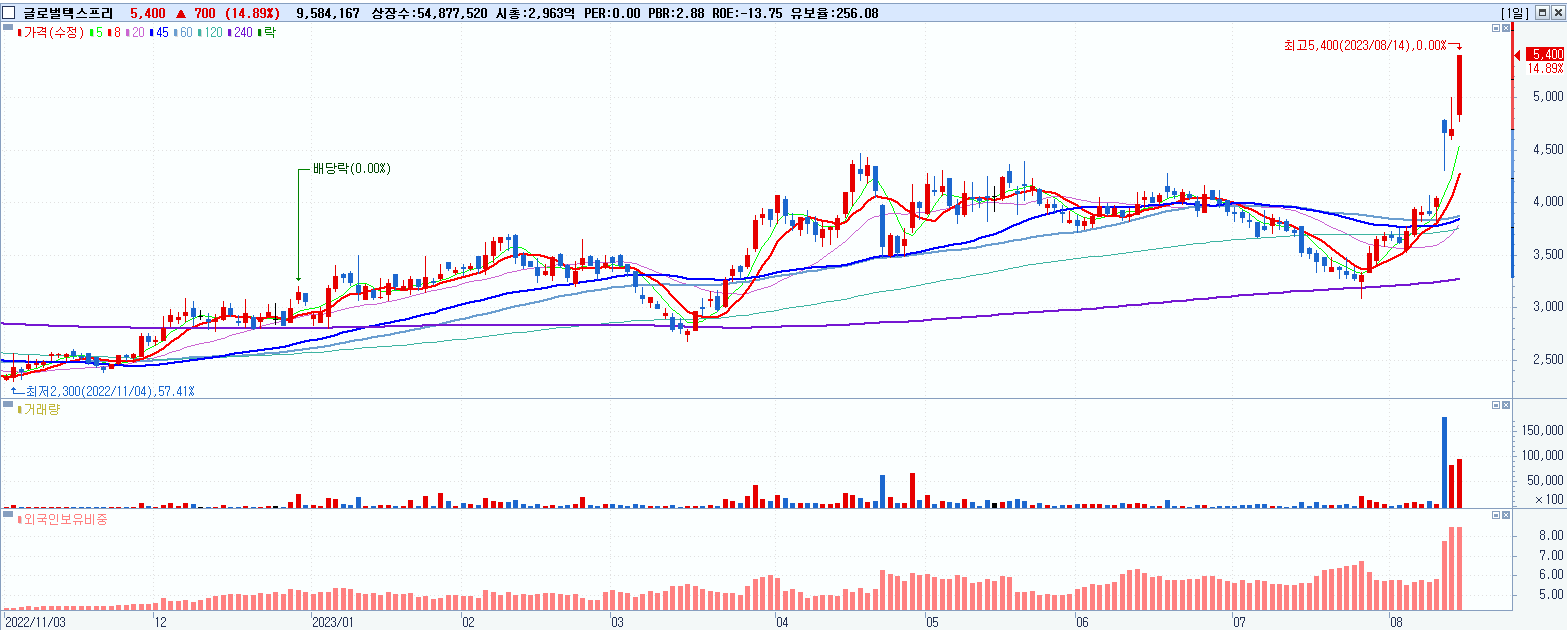 - 글로벌텍스프리 (5,400원 ▲ 14.89% , 시총: 2,963억, 거래량: 9,584,167, 거래대금:493억)