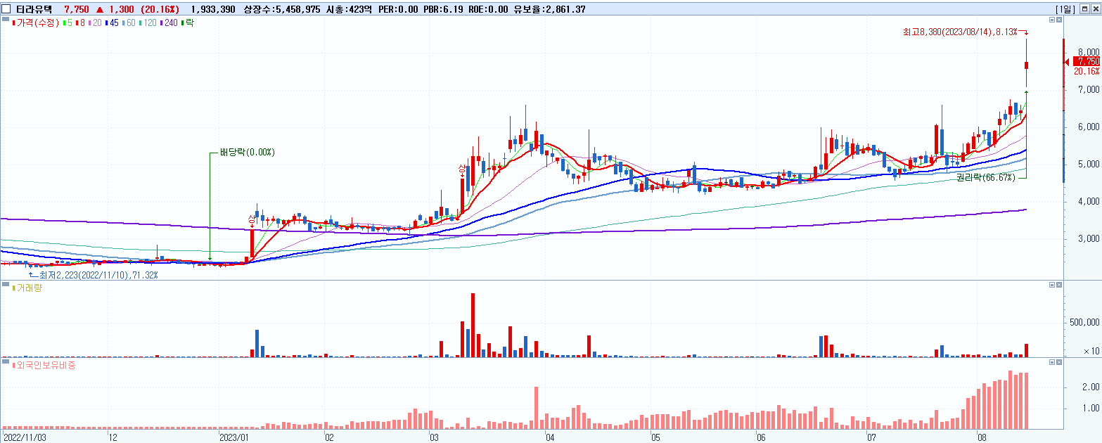 - 티라유텍 (7,750원 ▲ 20.16% , 시총: 423억, 거래량: 1,933,390, 거래대금:154억)