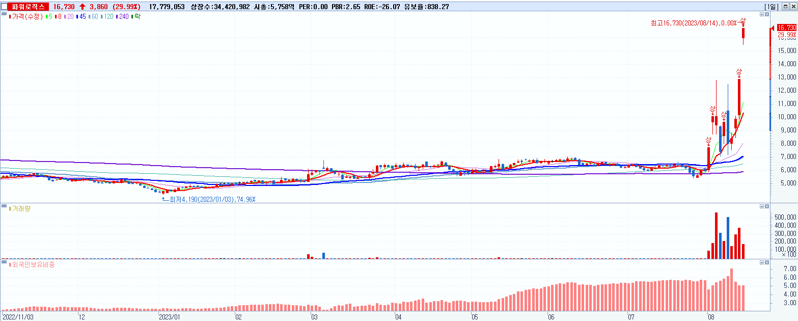 - 파워로직스 (16,730원 ▲ 29.99% , 시총: 5,759억, 거래량: 17,779,053, 거래대금:2,866억)