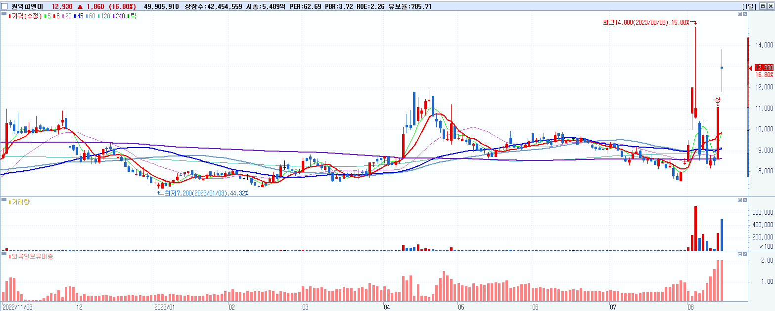 - 원익피앤이 (12,930원 ▲ 16.8% , 시총: 5,489억, 거래량: 49,905,910, 거래대금:6,419억)