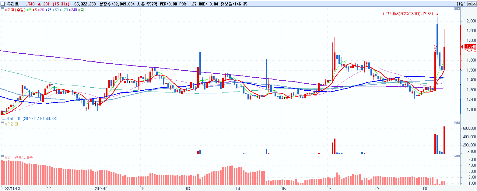 - 우리로 (1,740원 ▲ 15.31% , 시총: 558억, 거래량: 65,322,258, 거래대금:1,146억)