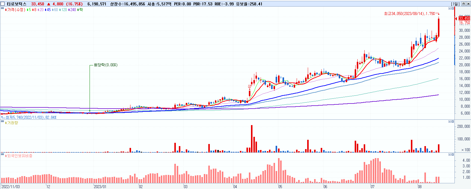- 티로보틱스 (33,450원 ▲ 16.75% , 시총: 5,518억, 거래량: 6,190,571, 거래대금:1,995억)