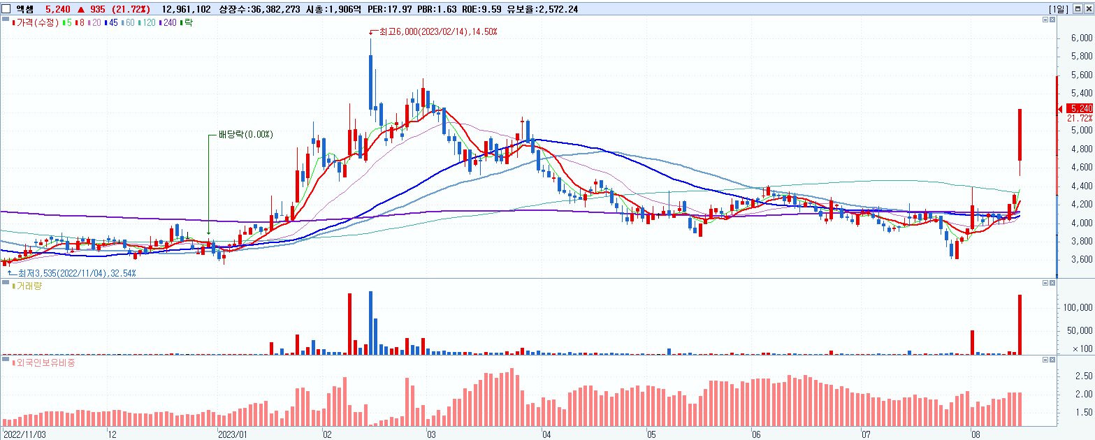- 엑셈 (5,240원 ▲ 21.72% , 시총: 1,906억, 거래량: 12,961,102, 거래대금:642억)