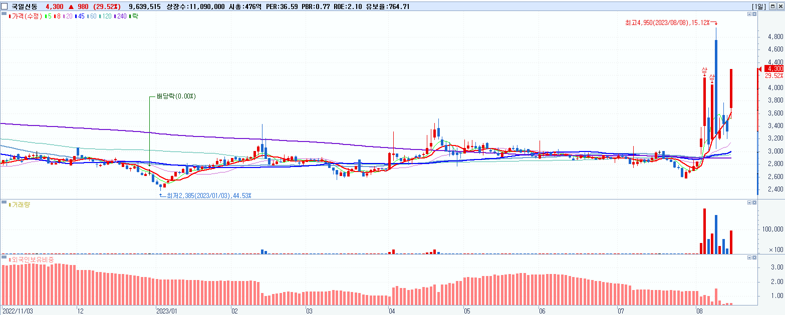 - 국일신동 (4,300원 ▲ 29.52% , 시총: 477억, 거래량: 9,639,515, 거래대금:381억)
