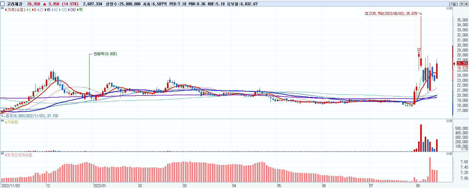 - 고려제강 (26,350원 ▲ 14.57% , 시총: 6,588억, 거래량: 2,687,334, 거래대금:695억)