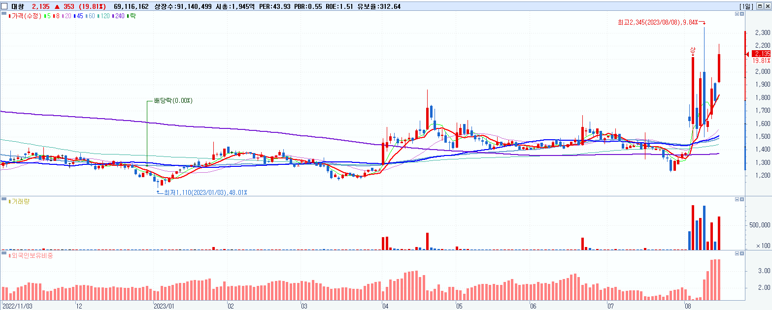 - 대창 (2,135원 ▲ 19.81% , 시총: 1,946억, 거래량: 69,116,162, 거래대금:1,433억)