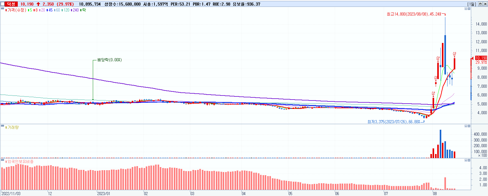 - 덕성 (10,190원 ▲ 29.97% , 시총: 1,598억, 거래량: 10,895,734, 거래대금:1,063억)