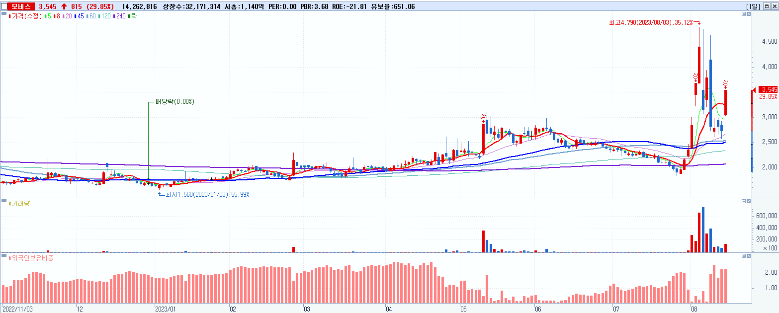 - 모비스 (3,545원 ▲ 29.85% , 시총: 1,140억, 거래량: 14,262,816, 거래대금:477억)