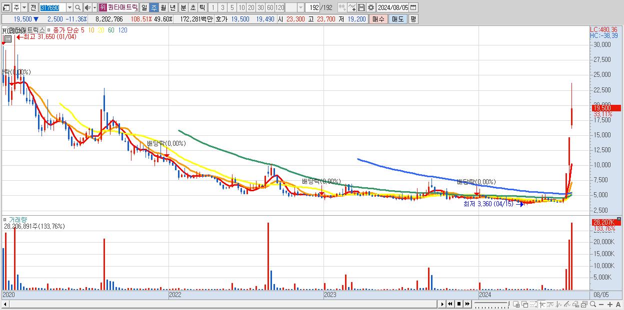 - 퀀타매트릭스 (19,500원 ▲ 33.11% , 시총: 3,225억, 거래량: 28,206,891, 거래대금:5,469억)